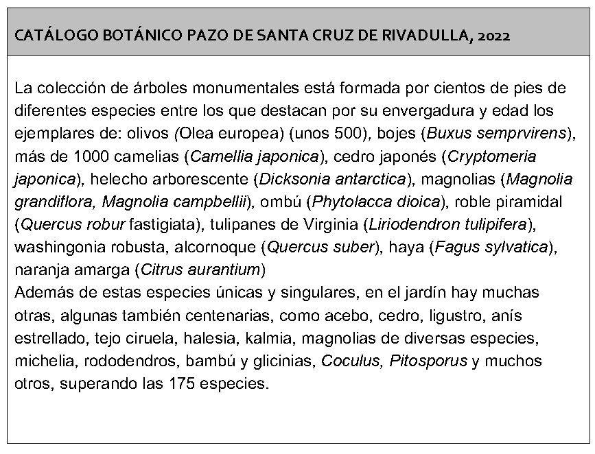 Este jardín es para muchos el espacio botánico ornamental más fascinante de Galicia, por su contenido florístico y su valor jardinero-paisajístico. Fue enriquecido en el siglo XIX , por don Iván Armada, conocido como el Tío Iván, quien aumentó considerablemente la colección de plantas, especialmente las camelias. Quizás los más importante de la propiedad sea el conjunto de árboles monumentales que reúne, entre los que podemos destacar: los paseos de camelias, olivos, boj, y gigantescas magnolias, el helecho australiano, la criptomeria, los tulipaneros de Virginia, el ombú, el roble piramidal, las palmeras Washingtonia, así como un naranjo que recuerda las antiguas plantaciones de cítricos de finca.