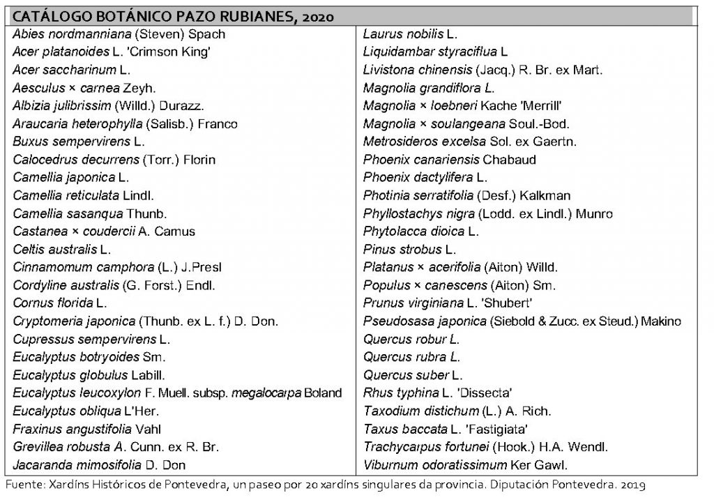 El mundo vegetal de Rubiáns goza de gran importancia en sus vertientes florística (cerca de 100 especies diferentes), jardinística y paisajística. Un total de 40 hectáreas repartidas en tres dominios: jardín, finca y arboleda. Se comenzó a construír en 1764, y aún se conserva el estanque de ranas, con su pérgola y glorieta emparradas. En 1850 se produce la plantación de las primeras camelias, regalo de los duques de Caminha (Portugal), y de las magnolias perennifolias.